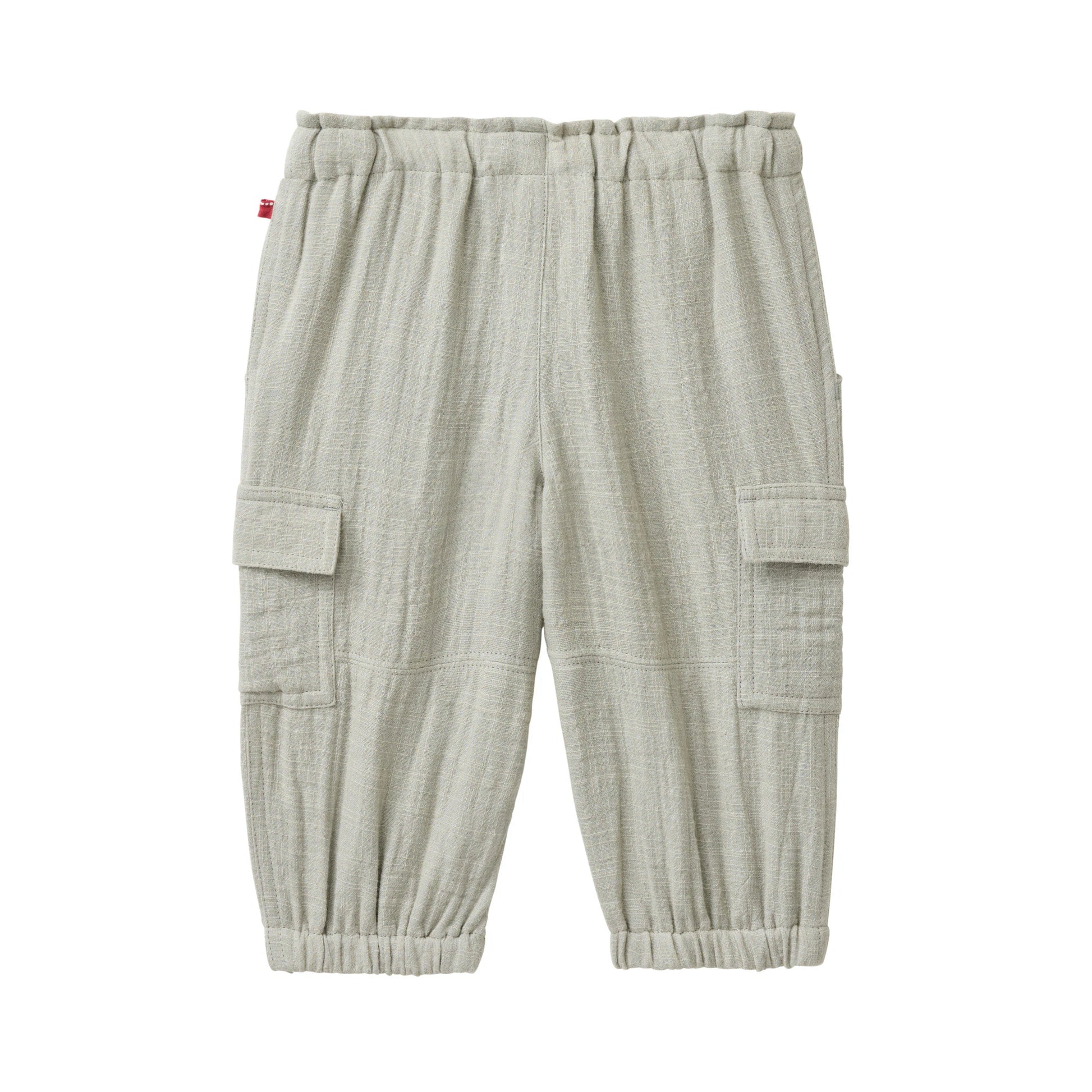 Byxor för baby och små barn i luftig och skön ekologisk bomull. Byxor i cargomodell med utanpåfickor på sidorna, resår och dragsko i midjan och resår i benslut. Rktigt bra sommarbyxor när man vill skydda de små från solen men ändå hålla dem svala!
