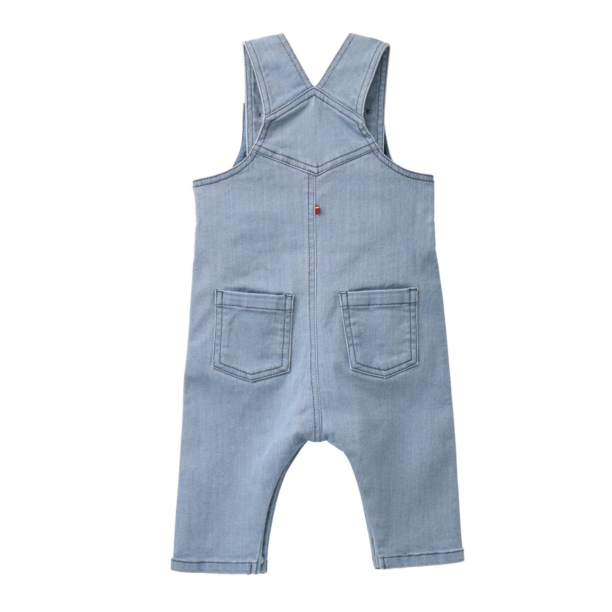 Hängselbyxor i blågrå stretch-twill. Ett bra plagg för små äventyrare som börjat krypa eller springa omkring. Sitter bra på plats utan något som klämmer åt eller skaver i midjan. Lite rejälare än mjukisbyxor men samtidigt bekväma och följsamma tack vare några procent elastan i tyget. Dubbla knappar på hängslena så att byxorna kan växa med barnet. Tryckknappar ner längs båda benen så att man kan öppna helt förenklar blöjbyte.