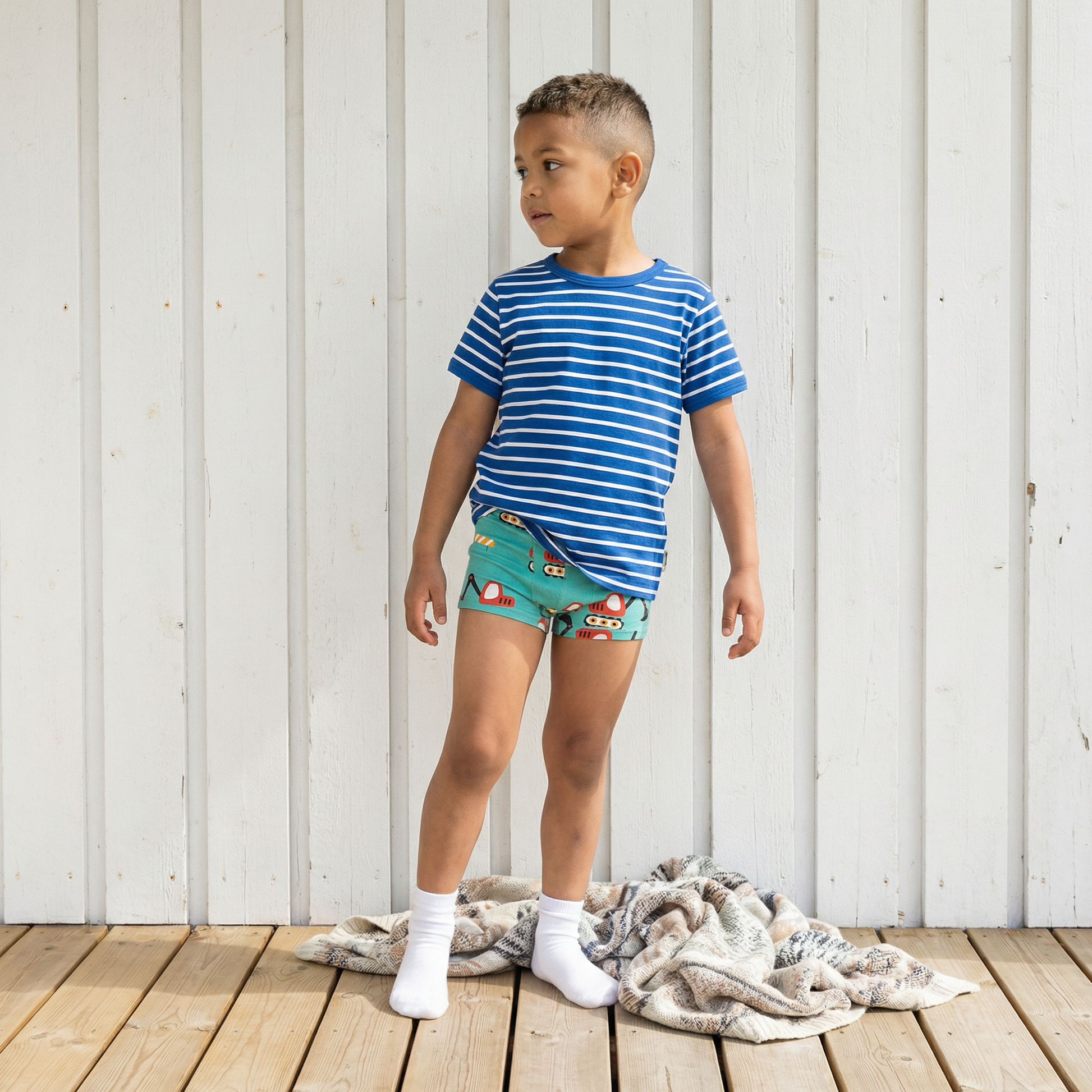 Ekologiska boxerkalsonger för barn med roligt grävmaskinsmönster i mjuk och behaglig ekologisk bomullstrikå.