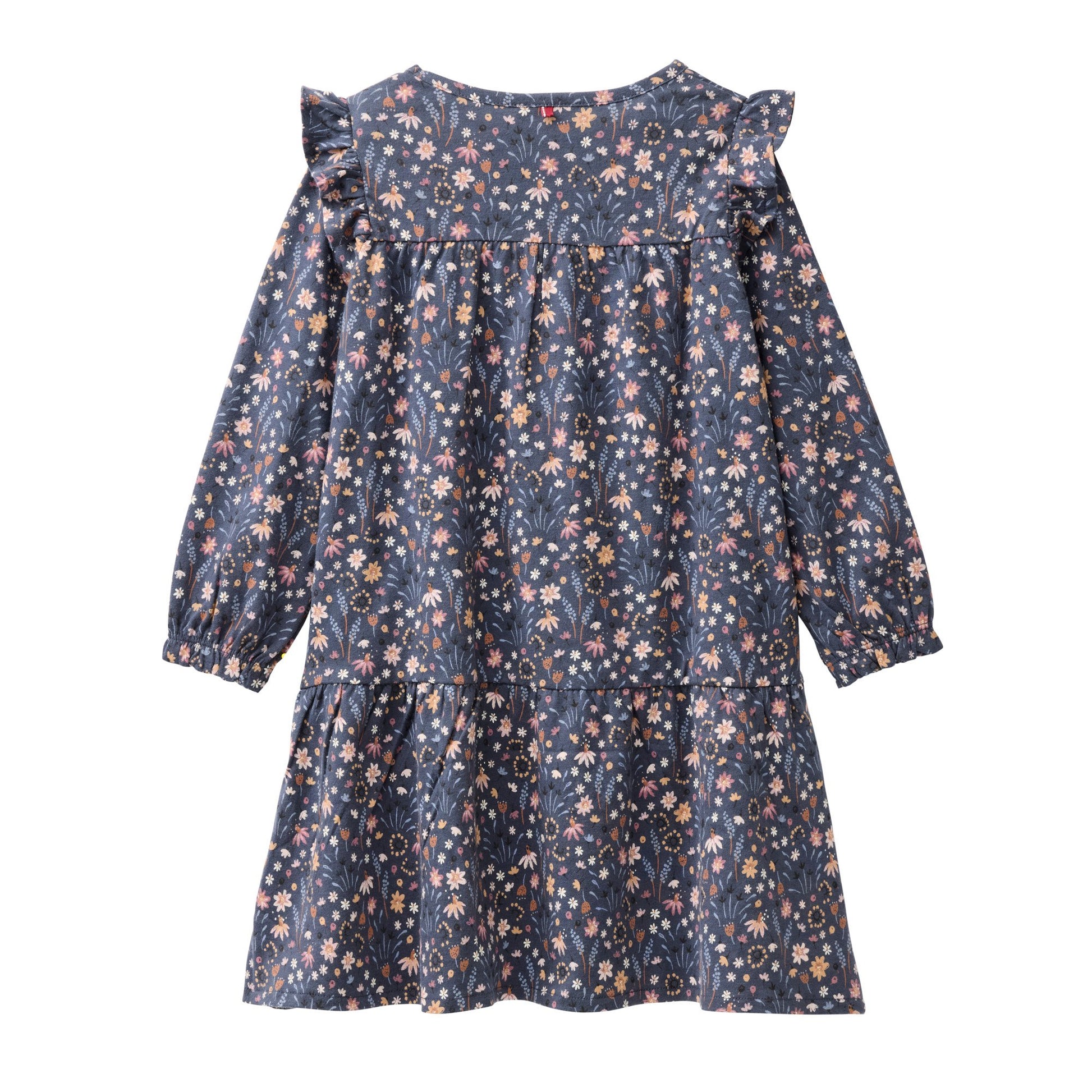 Långärmad klänning i mjuk ekologisk bomullstrikå med blommor på mörkblå botten. Resår i ärmslut och volang nedtill och på axlarna. En fin klänning som passar bra både till vardag och fest.