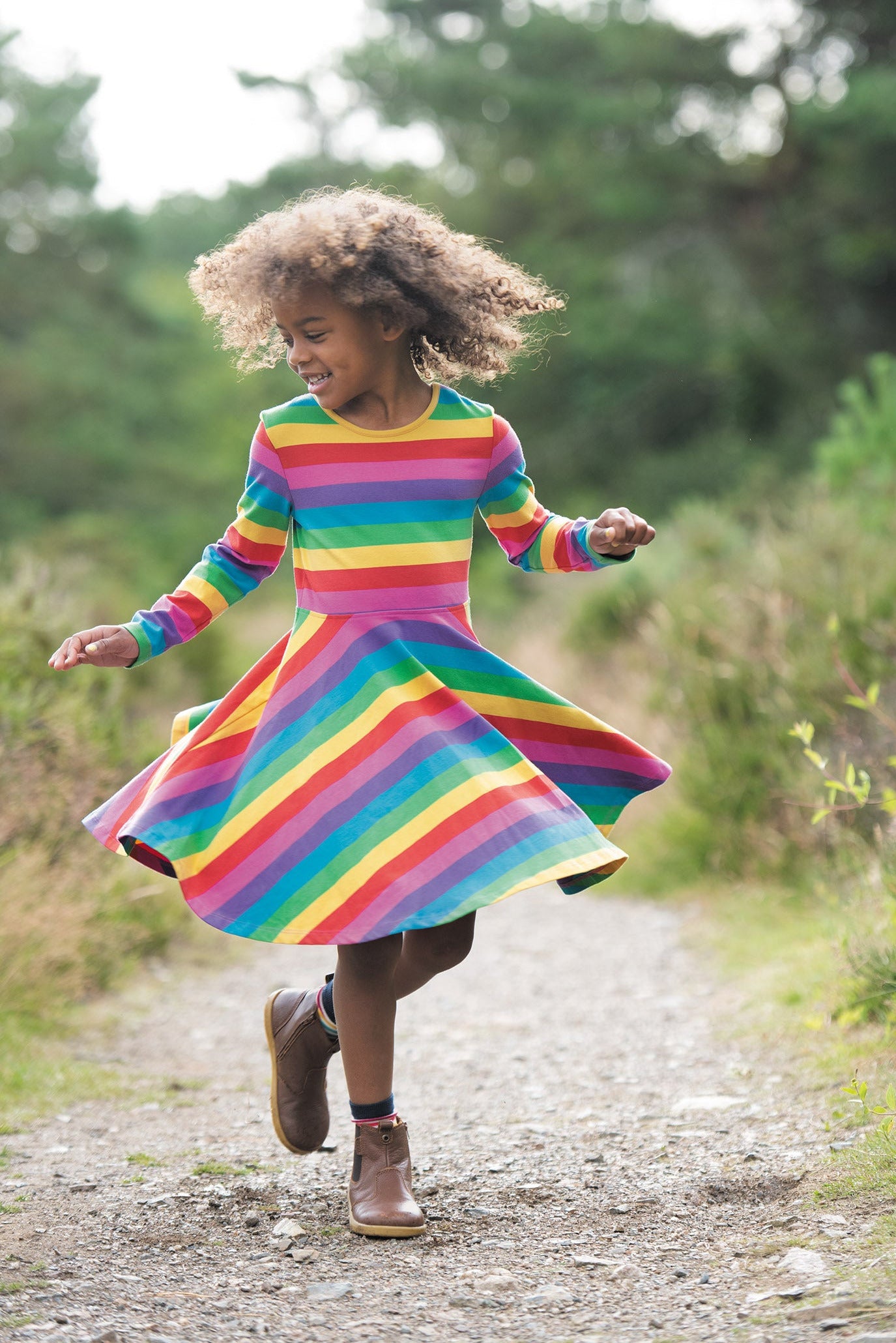 Underbart färgglad klänning med härlig vidd i kjolen. Kallas ofta snurrklänning eftersom den är så härlig att snurra och dansa i! Storlekar upp till 98/104 har tryckknappar på ena axeln.