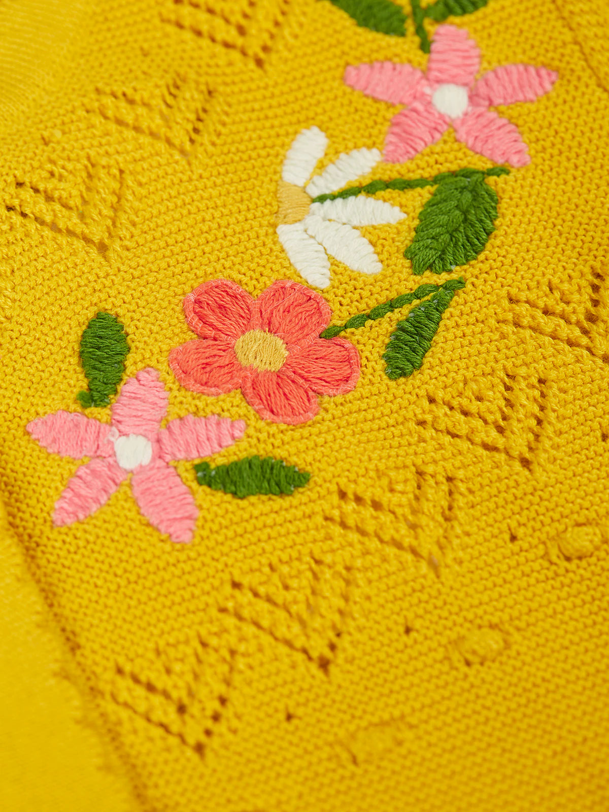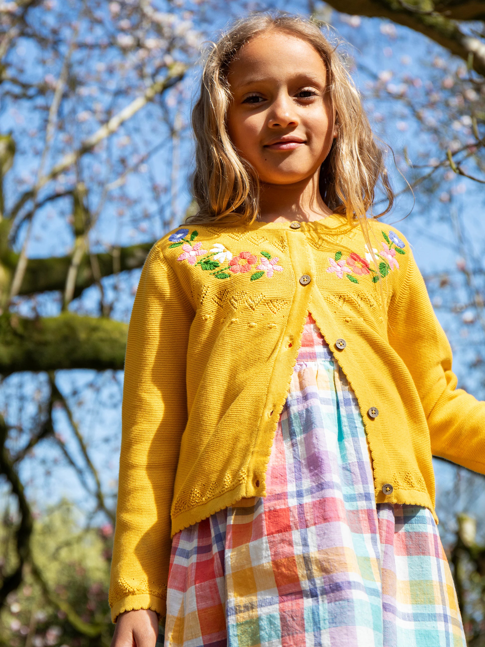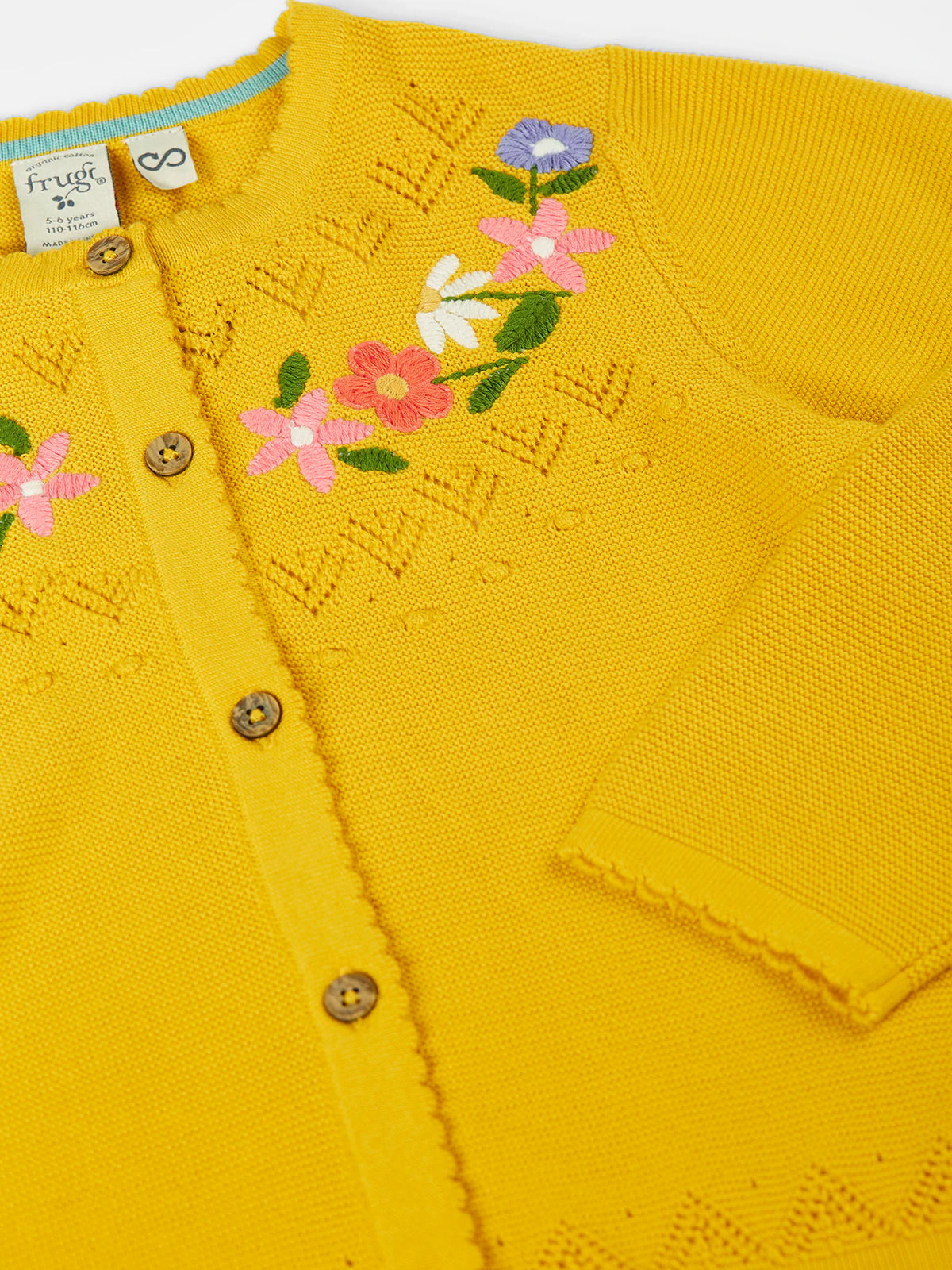 Underbar stickad kofta från Frugi i tunn mjuk ekologisk bomull. Koftan har hålmönster och fina färgglada blombroderier framtill. Frugis kläder är mycket välgjorda och håller hög kvalitet.