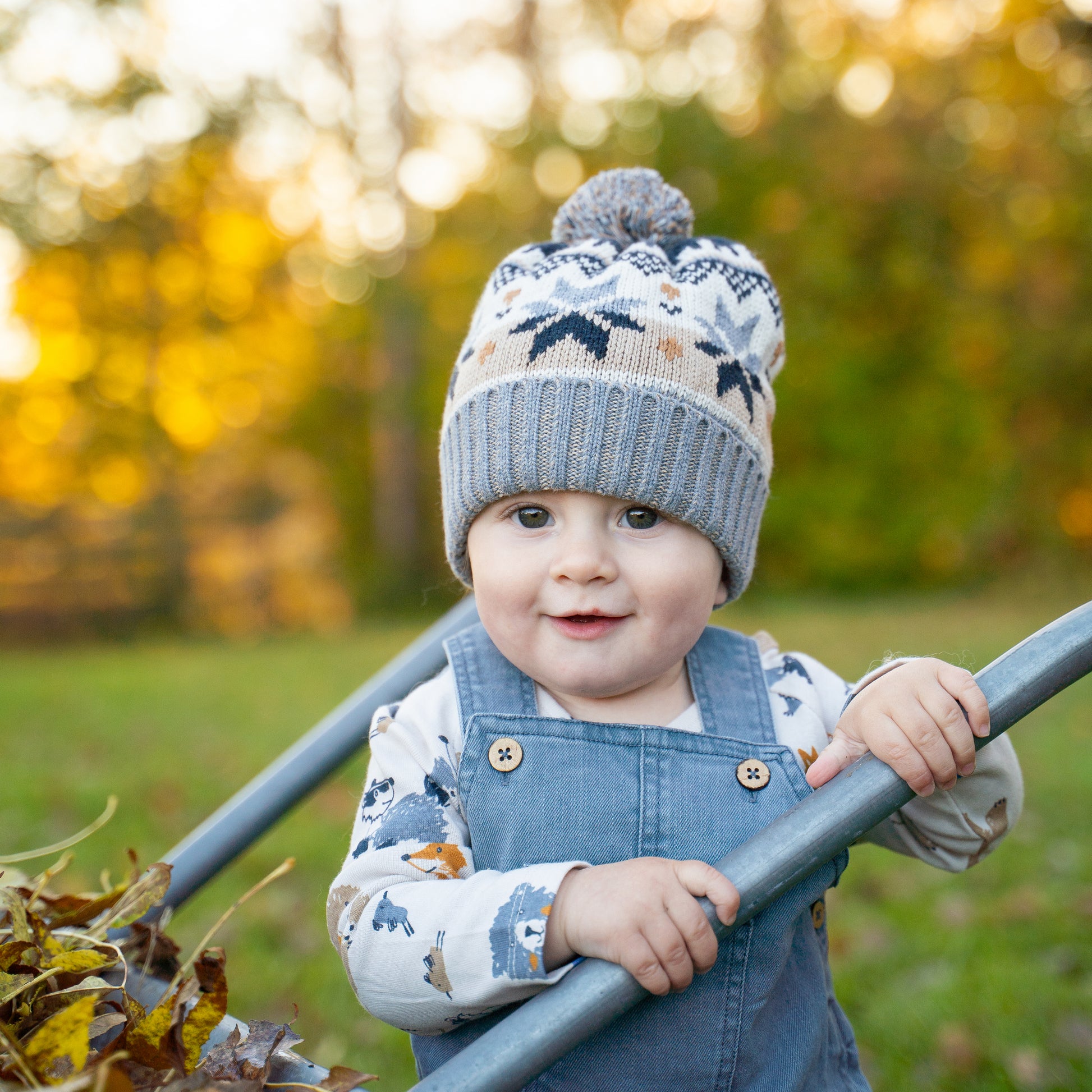 Mönsterstickad mössa i ekologiskt bomullsgarn med ribbstickad kant nertill och tofs upptill. Mössan har ett sött mönster med stjärnor.