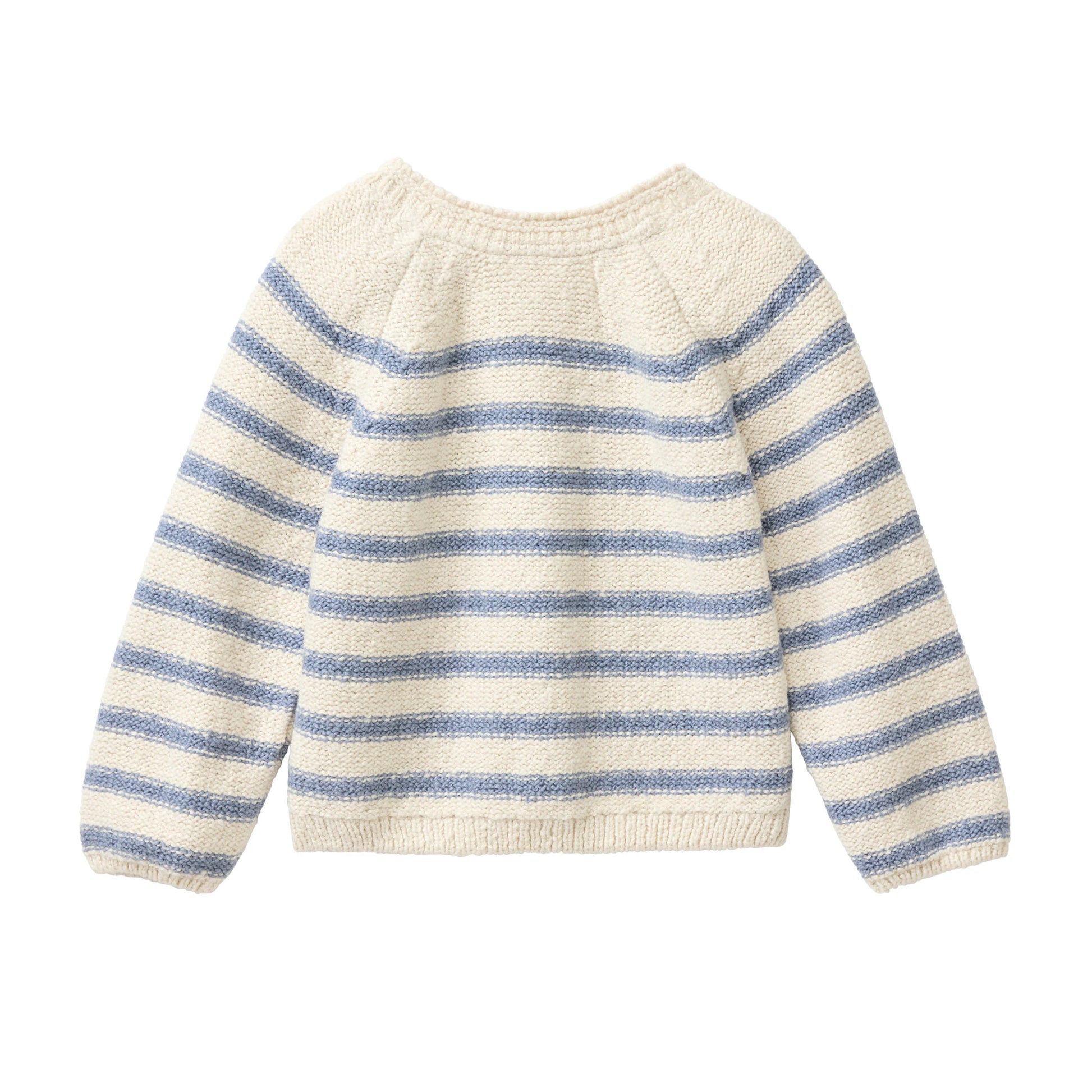 Härlig stickad tröja för baby och barn i mjuk ekologisk bomull med ränder. Raglanskärning med knäppning med träknappar på ena sidan.