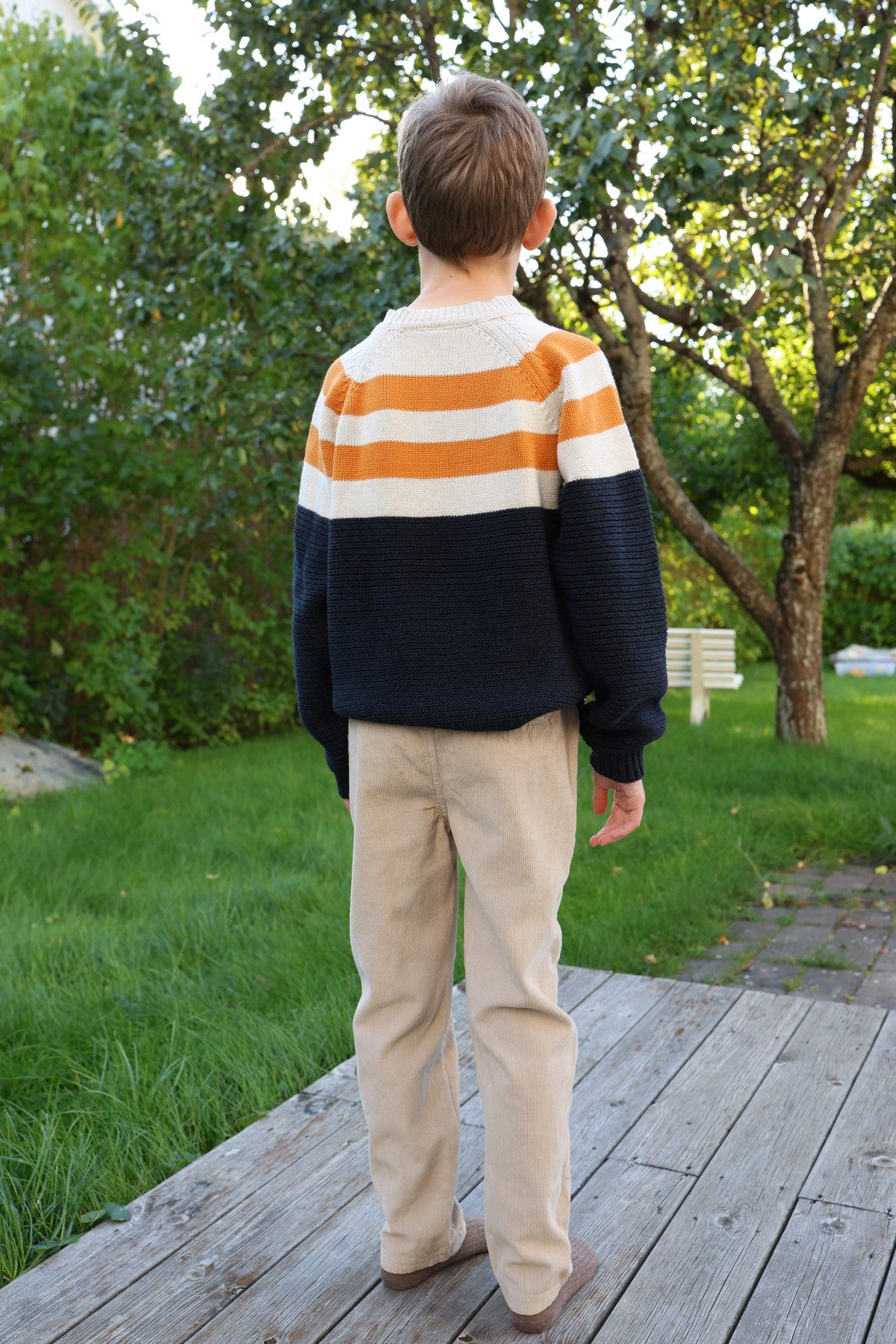 Stickad tröja i mjuk och skön ekologisk bomull med fält i mörkblå, naturvit och orange.