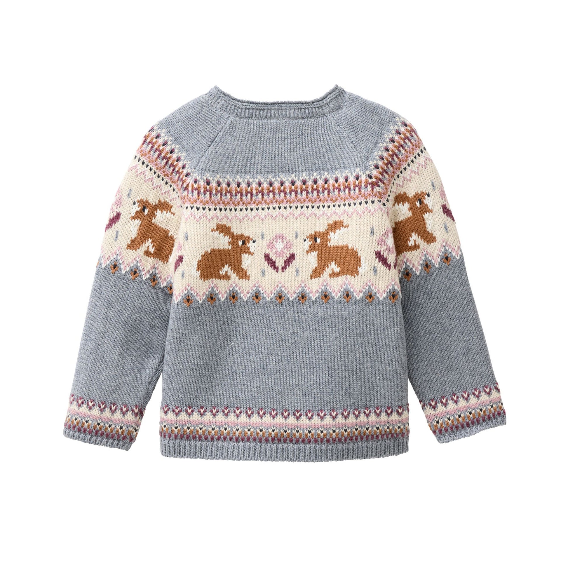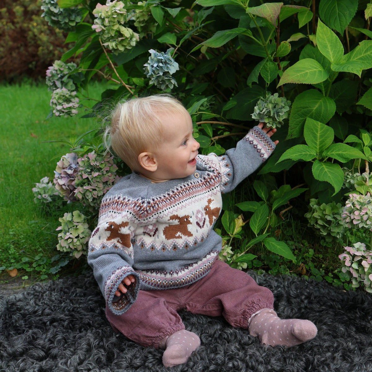 Ljuvlig mönsterstickad tröja för baby och barn i mjuk ekologisk bomull med mönster med kaniner och fält i gråblått. Raglanskärning med knäppning med träknappar på ena sidan.
