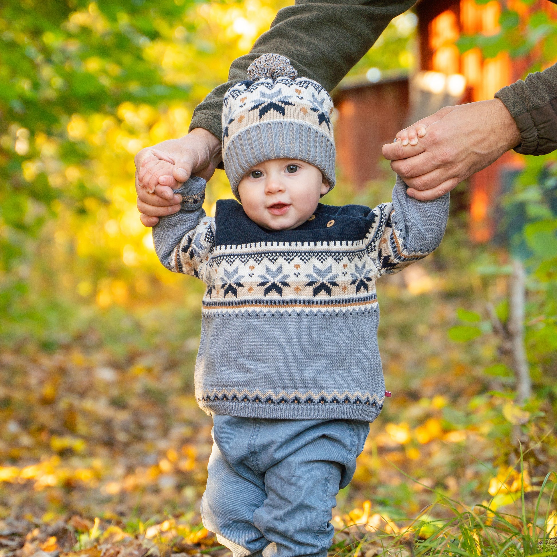 Underbart söt mönsterstickad tröja med stjärnor och fält i blågrått och mörkblått. Mjuk ekologisk bomull. Raglanskärning med knäppning med träknappar på ena sidan.