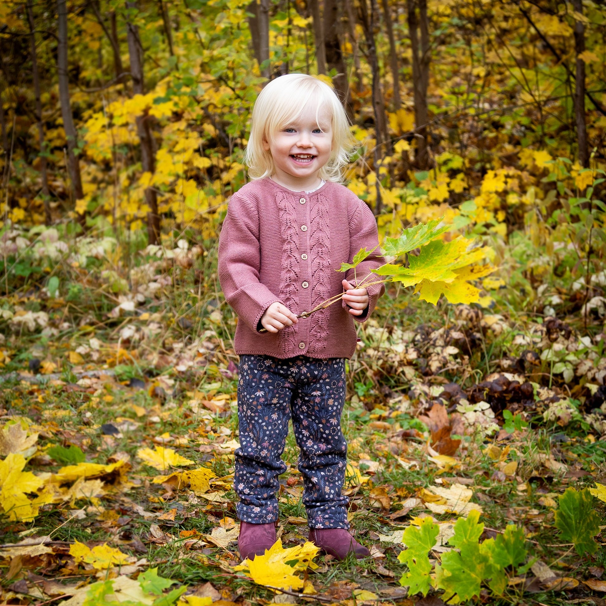 Mjuka och sköna stretchbyxor med fint blommönster i ekologisk bomull med mjuk borstad insida.