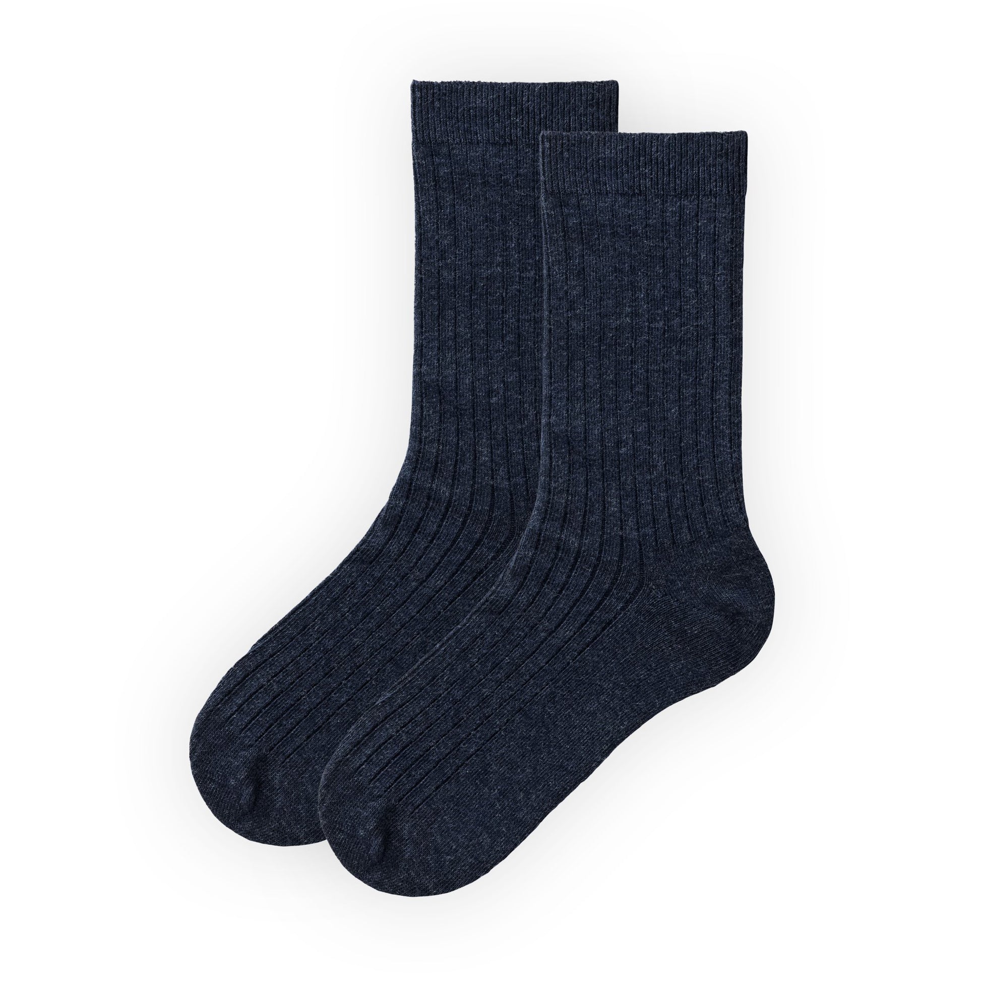 Tvåpack strumpor för barn i ribbad ekologisk bomull med några procent polyamid för ökad slitstyrka och elastan för skönare passform. Ett par mörkblå och ett par sandfärgade. Bekväma strumpor som sitter bra på foten.