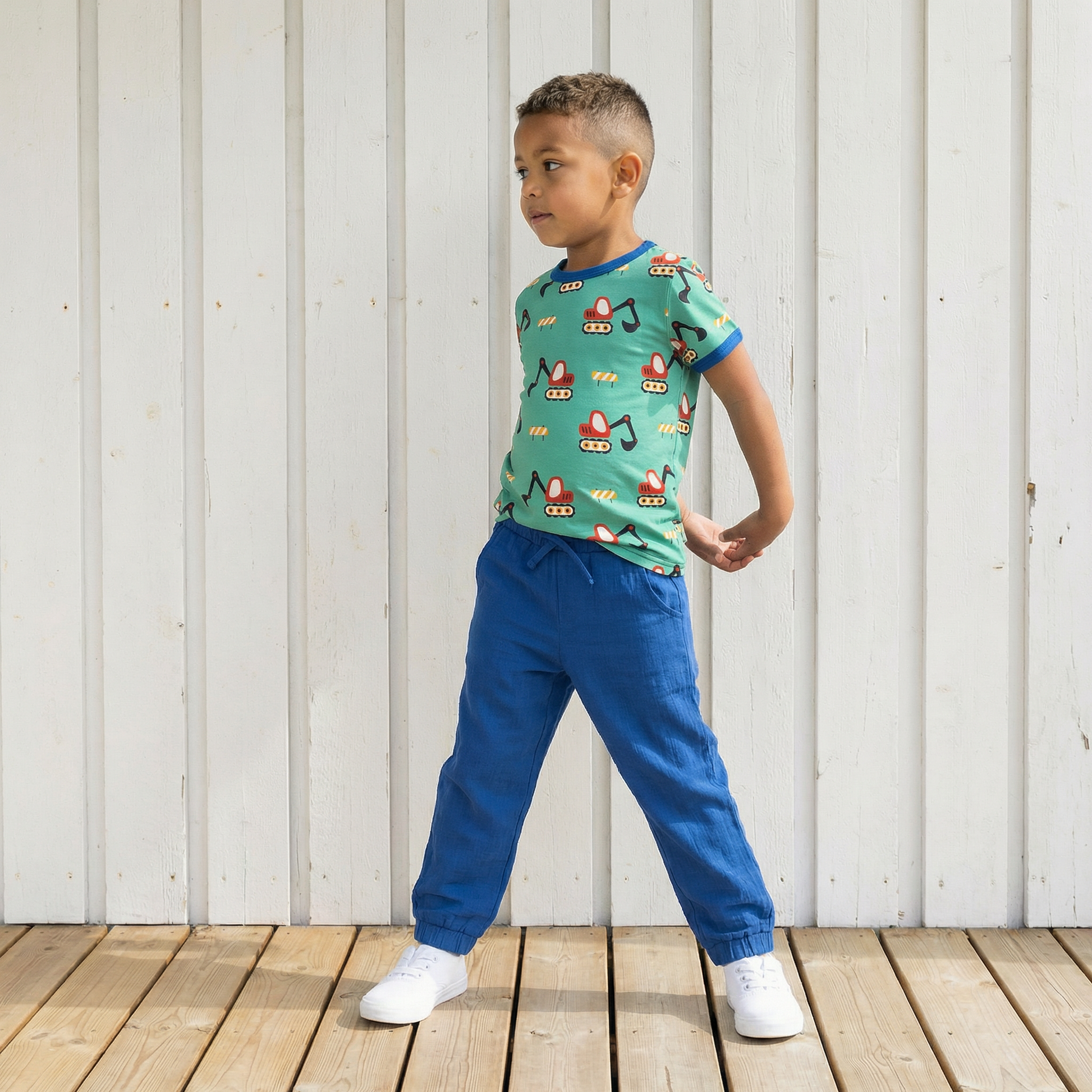 Härligt färgglad kortärmad t-shirt för barn med lekfullt grävmaskinsmönster i mjuk ekologisk bomullstrikå. Storlek 86/92 har tryckknappar på ena axeln.