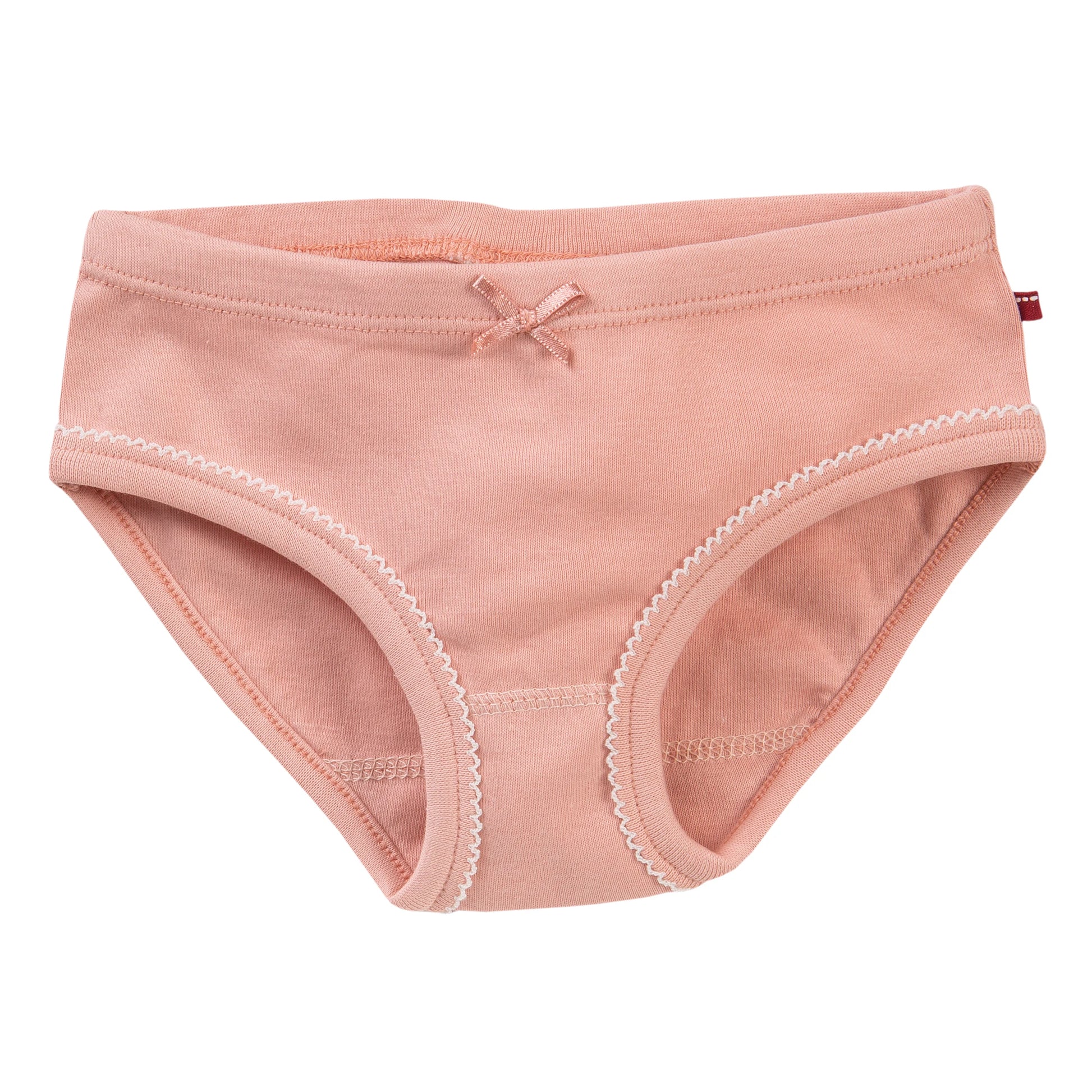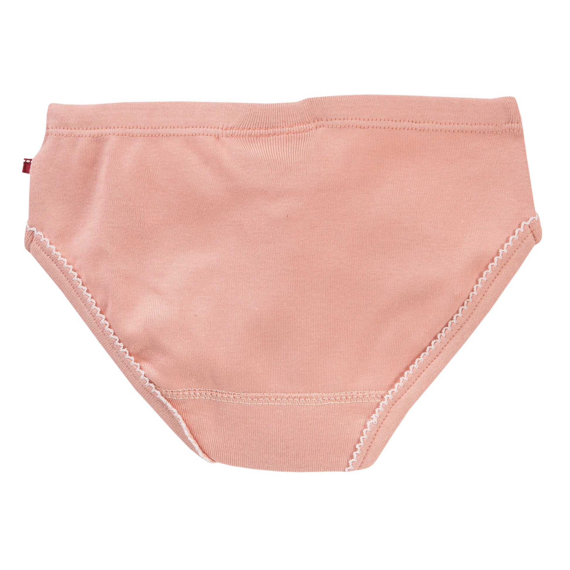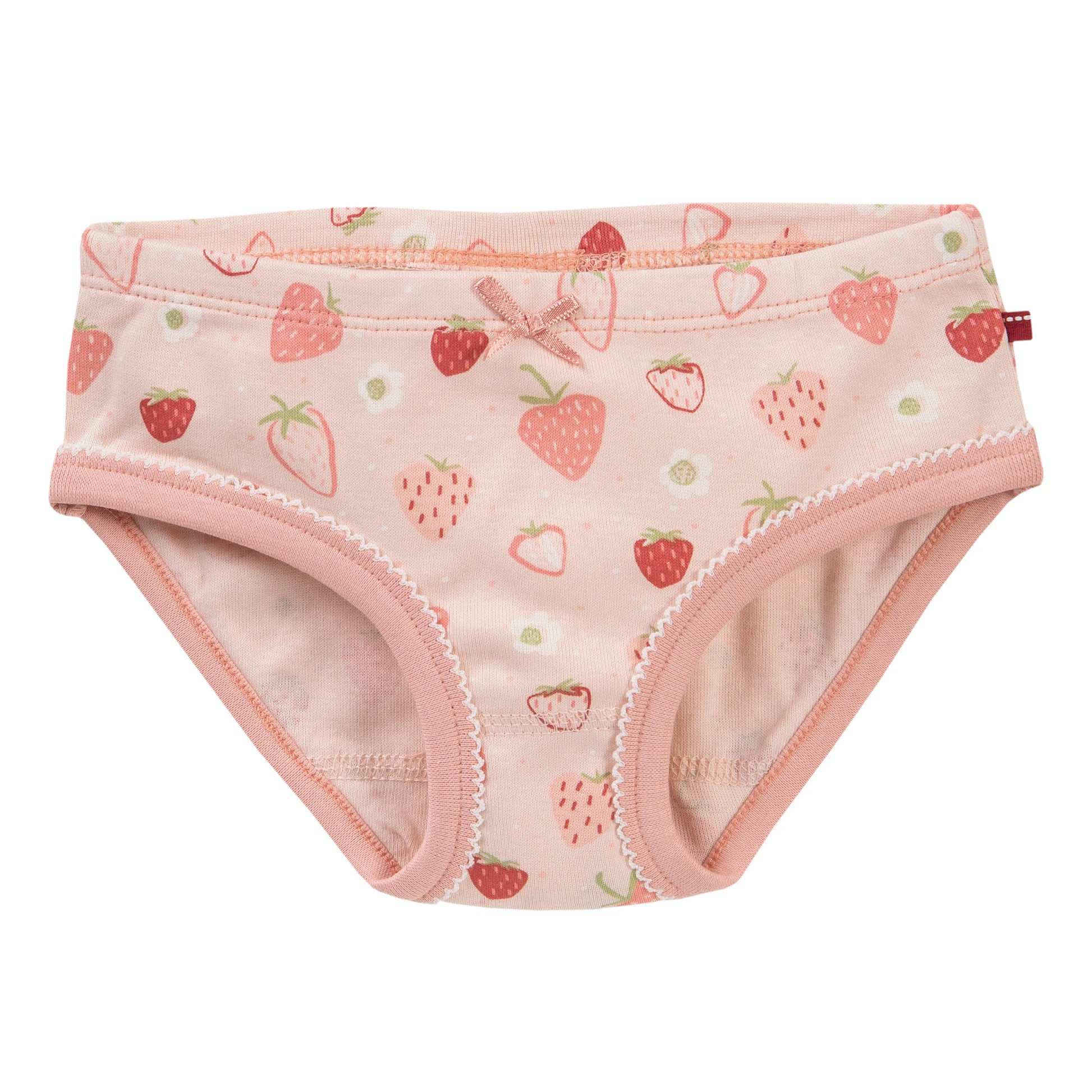 Tvåpack trosor för barn i ekologisk bomull. Ett par med sött jordgubbsmönster och ett par enfärgade i mjuk och skön ekologisk bomullstrikå. Söt uddkant och rosett mitt fram.